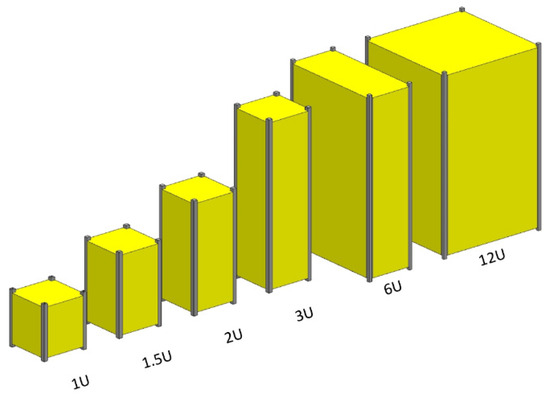 Any satellite with a weight below 10 kg is classified as a nanosatellite. CubeSats adhere to standardized dimensions known as “Units” or “U”, which measure 10 cm × 10 cm × 10 cm. These small satellites are available in six sizes: 1U, 1.5U, 2U, 3U, 6U, and 12U, and their weight is usually less than 2 kg per U [15]. Figure 3 shows the current CubeSat family as it is defined in the CDS. 1U, 1.5U, 2U, and 3U CubeSats have a base of 10 cm × 10 cm, changing the height to complete the number of units. For example, 6U CubeSats have a base of 10 cm × 20 cm and 12U CubeSats have a base of 20 cm × 20 cm, and both have the height of a 3U.
