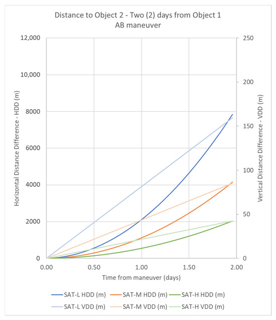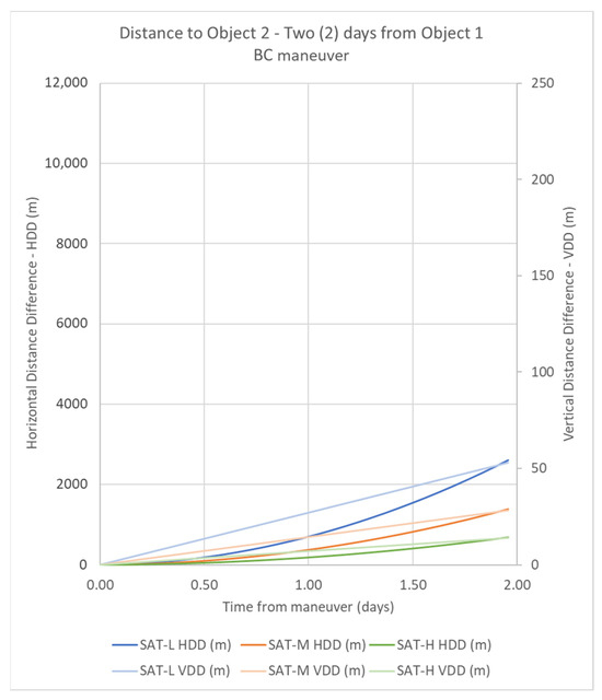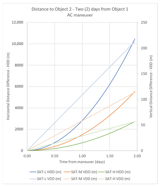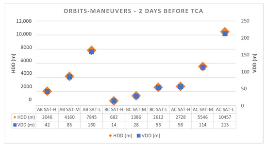 Figure 11 represents the values of HDD and VDD shown in Table 5. It can be seen that HDD and VDD are proportional for each satellite–maneuver combination. They are represented in Figure 11 using different scales for more clarity.