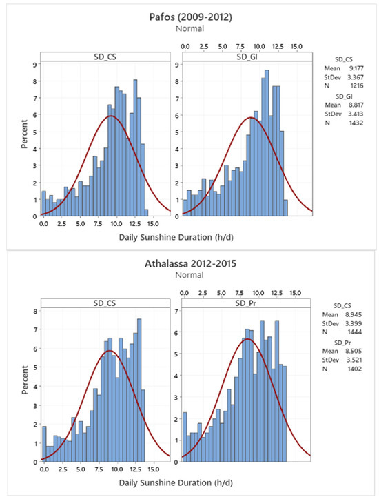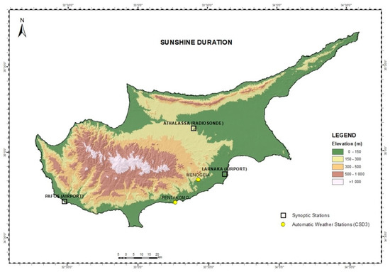 - Pashiardis, S.; Pelengaris, A.; Kalogirou, S.A. Gographical Distribution of Global Radiation and Sunshine Duration over the Island of Cyprus. Appl. Sci. 2023, 13, 5422. [Google Scholar] [CrossRef]