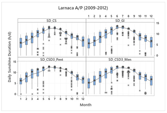The monthly variability in the daily sunshine duration is presented in the boxplot graphs (Figure 2). The smooth lines represent the mean values of SD for each month of the year, while the circles represent the median values and the asterisks the outliers. The highest values are recorded in the summer months reaching the value of about 13.5 h/d, while the lowest mean values range between 5.5 and 6.5 h/d occurring in December or January. The median values are generally slightly higher than the mean values. The outliers are more common during the spring and summer months.