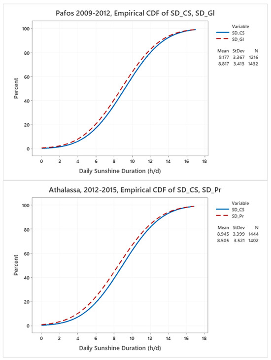 The percentages of the differences in the different pairs of the manual (CS) and electronic devices (Gl, Pr and CSD3), estimated by Equation (1) on a monthly basis, are shown in Table 3. The average annual sum of sunshine duration for the CS recorder at Larnaca reached a value of 3372.4 h, and this was 6.4 h higher than that measured using the pyranometric method. In the case of Pafos for the same pair of recorders, the annual average sum reached a value of 3415.0 h, which was 175.2 h higher than that measured using the pyranometric method. In the case of the comparisons of the pairs of CS and CSD3, the annual differences for Pentakomo are 112.7 h, while for Mennogia they are −111.5 h. The differences in absolute values are almost the same. In the case of Athalassa, the differences between the pair of CS and Pr are −150.7 h, i.e., the annual sum of CS sunshine recorder is higher than the CHP1 pyrhiliometer. Therefore, with the exception of the CSD3 sensor at Pentakomo, in the rest of the cases, the CS recorder measures higher annual values of SD than the automatic sensors.
