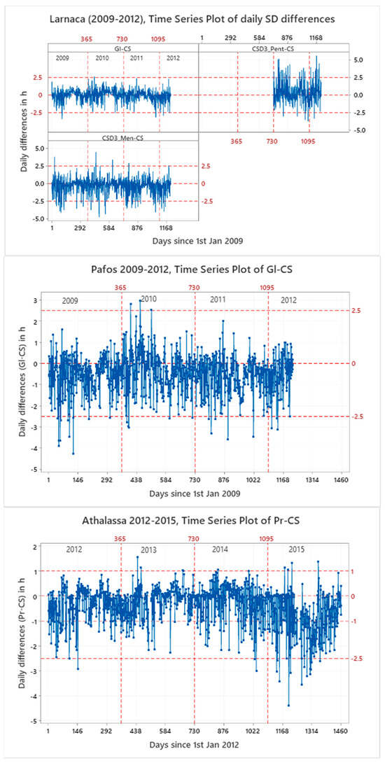 The time series plots for the differences in the daily SD totals among the pairs for the synoptic and automatic weather stations (AWSs) for the selected time periods are presented in Figure 5. As is indicated by the graphs, the daily differences for the sunshine recorders installed at the same location are mostly within the range of −2.5 to +2.5 h. However, in cases where the comparisons are between the synoptic and the automatic weather stations, these differences are slightly higher. At Larnaca in the period 2009–2012, positive differences between the pyranometric method (Gl) and CS are observed during the summer months, while negative differences are observed during the winter months. Negative differences between Gl and CS are also observed almost throughout the year for Pafos in the period 2009–2012. The maximum positive difference for the period 2009–2012, for the pair Gl and CS is 2.5 h for Larnaca and 3 h for Pafos, whereas the lowest differences reached the values of −3.4 and −4.3 h, respectively. Comparing Pr with CS for the period 2012–2015 at Athalassa, the maximum difference reached the value of 1.5 h, while the lowest difference reached −4.4 h. The comparisons of CS recording devices and CSD3 sensors showed slightly higher ranges. For example, in a comparison of CS at Larnaca and CSD3 at Mennogia, the maximum difference is 4.5 h, and the lowest difference is −4.7 h. This is expected since CSD3 measures the SD at the AWSs, which are located in a short distance from the synoptic station. The average annual daily differences between the different pairs range between 0.3 and 0.5 h, which are approximately 18 and 30 min.