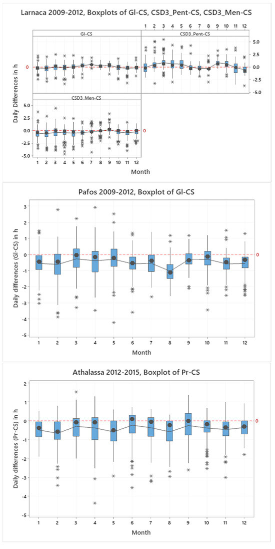 The variability in the daily differences among the pairs of SD for each month of the year is demonstrated for each location for the selected time periods through the graph of boxplots (Figure 6). As is indicated by the graphs, the median values are very close to the means. All the months show outliers. The variability of the winter months for Larnaca and Pafos is higher than the summer months as is indicated by the length of the boxes, since during the summer months, the atmosphere is mostly clear in all locations. In contrast, the variability between Pr and CS at Athalassa is higher in the summer months.