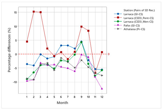 Figure 7 shows the percentage difference between automatic devices and CS recorders for each month of the year for the selected study locations. It has to be noted that a positive percentage difference indicates that the automatic sensor measures higher sunshine duration than the CS recorder. Overall, with the exception of the CSD3_Pent and CS pair at Larnaca, the percentage difference is typically negative. The positive difference in the said pair is recorded in the periods from December to April and August to October. The highest positive difference is recorded in February and March reaching the value of approximately 15%. A secondary positive difference is observed in autumn (September to October). The positive differences could be attributed to the fact that the compared pair is located at a distance of about 35 km, where the weather conditions, with respect to the cloud cover, would be probably differ. The lowest negative value was observed in November (−6.8%), while during the rest of the months it was around 1%. Positive differences were also observed between the pair Gl and CS for Larnaca during the summer ranging from 2% to 4.5%. The lowest negative difference was recorded in December reaching the value of −12.5%.