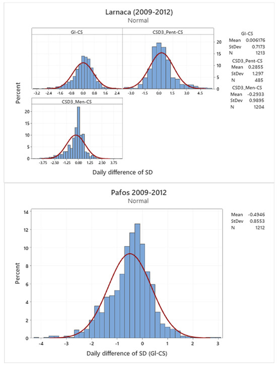 Table 5 shows the monthly frequencies of daily differences in sunshine duration between the selected pairs of sunshine recorders in different time periods. Almost all the year around, over 50% of the differences between Gl and CS are within the classes −C2 and C2 at Larnaca. However, for the same pair at Pafos, and the same range of classes, over 50% of differences are recorded from September to December. Regarding the pair of CSD3_Men and CS at Larnaca (2009–2012) and the Pr and CS pair at Athalassa (2012–2015), over 50% of the differences were within the range of −C2 to C2, almost all year around.