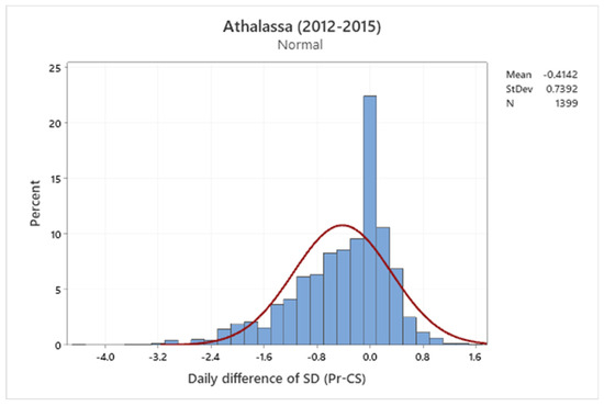 Figure 8 shows histograms for the daily differences among the different pairs of sunshine recorders. Generally, in all cases, the histograms resemble a normal distribution, as is indicated by the red line on the graph. Similar results were found by Kerr and Tabony [24] and Legg [15].