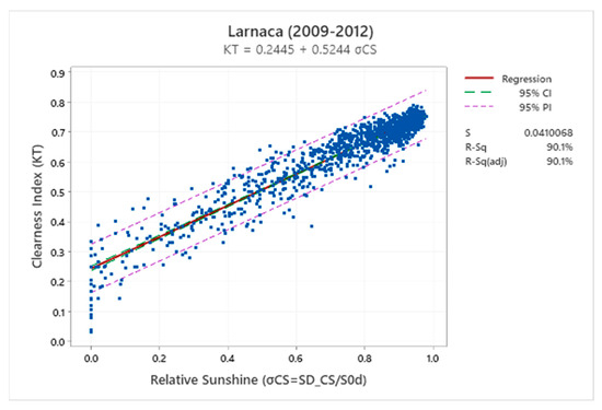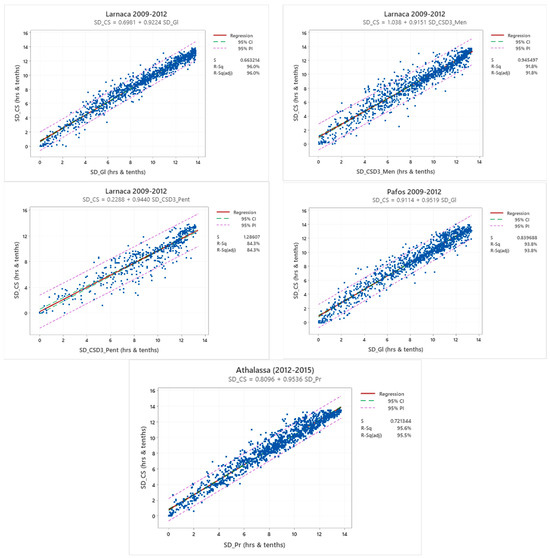 Figure 9 shows scatterplots for different pairs of sunshine recorders at the three synoptic stations for the different periods of measurement. The correlation between individual daily SD records is strong, as is indicated by the coefficient of determination (R2) which ranges between 0.84 and 0.96. The lowest correlation was recorded between the daily CS at Larnaca and CSD3 at Pentakomo. Scatterplots with the regression lines for four months of the year representing the four seasons of the year are shown in Figure 10. The parameters of the linear equations on a monthly and annual basis for all the pairs are shown in Table 6. The lower R2 was obtained for the cases of comparisons of the sunshine recorders with the CSD3 sensors which are installed in the AWS close to the synoptic ones. A higher dispersion is observed in the middle of the graphs rather than towards the tops and bottoms of the regression lines. This can be attributed to the fact that on mostly cloudy (low daily SD) or mostly clear and sunny (high daily SD) days, the instruments tend to measure similar sunshine durations. In contrast, at intermediate sunshine conditions (middling daily sunshine durations), SD measured by each instrument tends to be more dissimilar, due to the different sensitivity of each instrument. For example, the CS device will require a certain time of sustained sunshine for a trace to burn through the sun card. In contrast, the automatic instruments are more sensitive to detecting cloud changes. As is expected, the length of the prediction intervals for the cases of comparisons between CS sunshine recorders and CSD3 sensors is higher, due to the fact that the cloud appearance in the neighbor stations will be probably slightly different than those at the synoptic stations (Table 6).