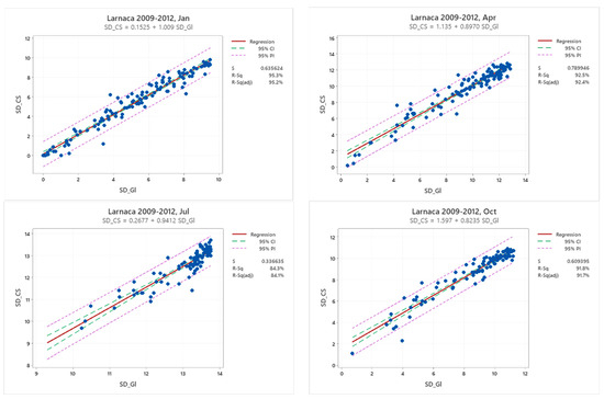 Scatterplots of daily SD for the pair of CS and Gl for Larnaca for the period 2009–2012 for four months representing the four seasons of the year.