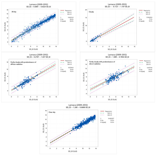 Scatterplots of daily sunshine duration recorded by Campbell–Stokes recorder (CS) and SD obtained from global radiation measurements (Gl) under different sky conditions for Larnaca during the period 2009–2012.