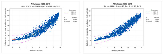 The empirical coefficients of the Angström–Prescott (A–P) formulation for different pairs are very close. The parameter α ranges from 0.227 to 0.298, while b varies from 0.468 to 0.533. The dispersion of the empirical values is small, since all the stations have almost the same climatic conditions. The coefficients of determination are very high, ranging from 0.728 to 0.907. The lowest values are obtained in the cases when the relative sunshine was measured by automatic stations equipped with CSD3 recorders. Otherwise, R2 is around 0.90. It has to be noted that the empirical coefficients for the same location but in different time periods are almost similar. The daily direct horizontal irradiation is closely related to the daily sunshine duration through quadratic equations.