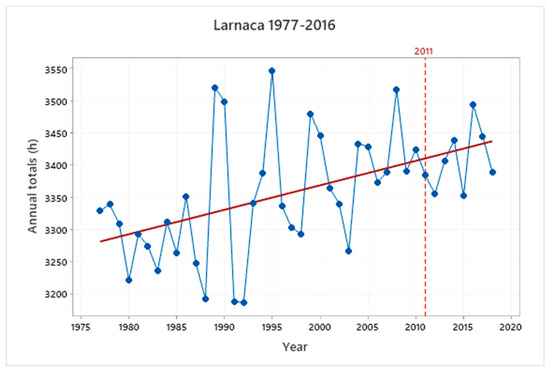 The linear relationships between CS and the automatic sensors can be used to extend the time series of CS measurements. The slope of the trend line of the annual totals of SD for the whole period of measurements, in the case of Larnaca, it is positive, and it is statistically significantly different from zero at the 5% significant level. In contrast, the slopes at Pafos and Athalassa are negative, but they are not statistically significant from zero at the 5% significant level. The study could also be extended to compare the automatic sensors between themselves. Furthermore, satellite data can be compared with ground-based data.
