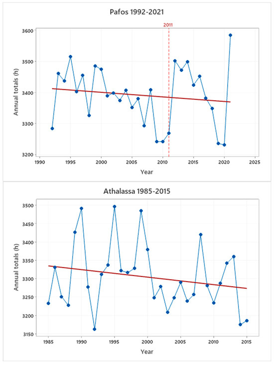 Trend lines of the annual sunshine duration totals during the whole period of measurements at the three synoptic stations. The reference line of 2011 indicates the end of CS measurements at Larnaca and Pafos, while at Athalassathe CS was recorded until 2015.