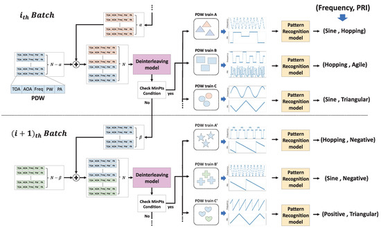 In electronic warfare, classification of the radar emitters involves several steps [8]. First, pulse descriptor words (PDWs) are generated from the received radar signals. Each PDW includes details about a specific radar pulse, such as TOA (time of arrival), AOA (angle of arrival), frequency, PW (pulse width), PA (pulse amplitude), etc. [9]. Second, the generated PDWs are deinterleaved. Deinterleaving is the process of separating jumbled PDWs back into individual sequences of pulses, which are referred to as PDW trains, each one corresponding to a different emitter [10,11]. Figure 1 illustrates the radar deinterleaving process.