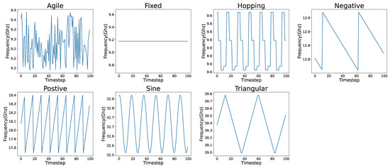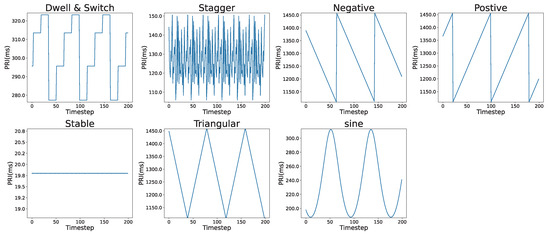 For the experiment in this paper, 500 episodes of radar signals were generated, using a simulated signal generator. Among these episodes, 400 episodes were utilized as train data, while the remaining 100 episodes were used as test data. The radar data were episode-wise alike but had different values of AOA, Frequency, PW, and PA within the margin of errors, and they were organized in different TOA order. Thus, by validating the model, which was designed based on train data, with test data, we could check whether the generalization performance was guaranteed. Within each episode, 43 different radar emitters were active, emitting a total of 1500 pulses. These pulses were captured and stored as PDWs, serving as the input for the subsequent deinterleaving and recognition stages. The PDW dataset consisted of a wide range of radar emitter classes, each characterized by distinct PRI patterns and frequency patterns. The frequency patterns encompassed agile, fixed, hopping, negative, positive, sine, and triangular, while the PRI patterns included options such as dwell and switch, stagger, negative, positive, stable, triangular, and sine. Figure 4 and Figure 5 illustrate examples of these frequency patterns and PRI patterns, respectively. We performed one-hot encoding on the class information, yielding a total of 43 classes used as experimental data.