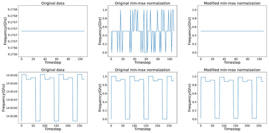 The original minmax normalization and modified minmax normalization were compared with frequency pattern examples. Signals with patterns other than the fixed pattern showed minimal differences between their results (below). However, in the case of the fixed pattern (above), the original minmax normalization failed to preserve the pattern’s fixed shape within the 0 to 1 scale, as noise amplification occurred. On the other hand, the modified minmax normalization successfully maintained the fixed pattern’s shape.