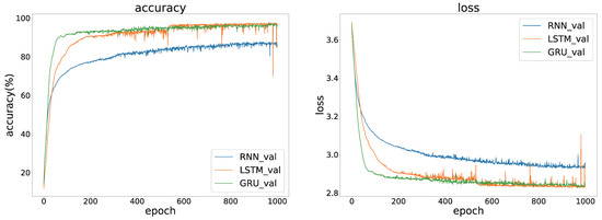 The preprocessed data was divided into train and validation sets, in a ratio of 9:1. The reason why we divided the dataset into training and validation sets was to assess the model’s generalization performance, ensuring it did not overfit to the train set. The train set was used to train the radar pattern recognition model. We adopted different types of RNN encoder, such as vanilla RNN, LSTM, and GRU, while keeping all the other conditions fixed. Initially, we set the dimension of the hidden state in the RNN encoder to 8. The final context vector obtained from the RNN encoder with four layers was of dimension 4 × 8 = 32. The number of three fully connected layers nodes that made up the classifier was set to 1024, 512, and 256 in that order. The model architecture is presented in Table 3.