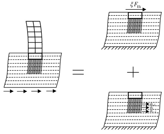 As mentioned above, the internal force of the pile body of the pile foundation is generally affected by inertial interaction and motion interaction. To simplify the calculation, the two effects are calculated separately, and then the combination is taken as the comprehensive effect of the earthquake load [27], as shown in Figure 1.