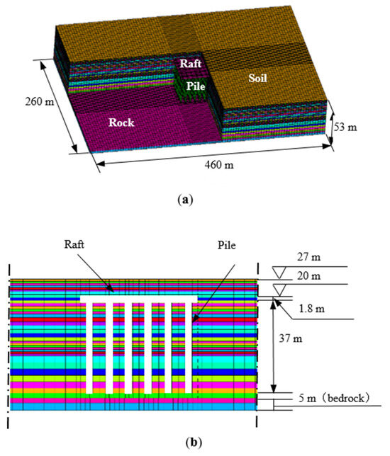 The horizontal dimension of the calculation model is approximately four times the size of the raft [39] (460 m in the X direction and 260 m in the Y direction), and the vertical dimension is 53 m. In this study, both the soil and pile were simulated using solid elements with shared nodes at the pile–soil–raft interface. The nonlinear deformation characteristics of this part of the soil were simulated by refining the soil grid around the pile. The maximum horizontal and vertical grid sizes of the model are 8 m and 3 m, respectively. The minimum grid sizes are 0.9 m and 1 m, respectively. Due to the large size of the model and considering that comparative analysis is the main focus of this study, the selection of grid size is based on meeting the requirements of dynamic calculation [40], that is, the vertical grid size (1/5–1/8)/Vs/fmax, and the horizontal grid size is taken as 3–5 hmax, where fmax is the highest frequency considered in the dynamic calculation, and hmax is the maximum value among the vertical grid sizes obtained for different soil layers.