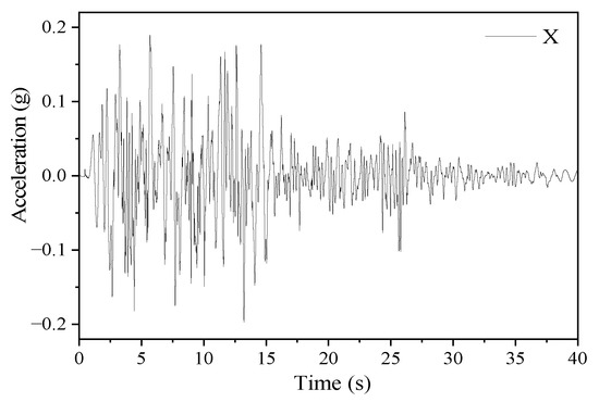 The site class is III, the characteristic period is 0.65 s, and the rare earthquake action of 8 degrees seismic intensity is considered. According to the requirements of the specification, three sets of seismic waves, including the El Centro wave, Northridge wave, and artificial seismic wave (as shown in Figure 5), with the same size class and the corresponding peak value adjusted to 0.2 g, are used for the calculation to ensure that the actual ground motion is consistent with the one-dimensional wave theory solution. In the time history analysis, the model boundary adopts a viscoelastic artificial boundary [25].