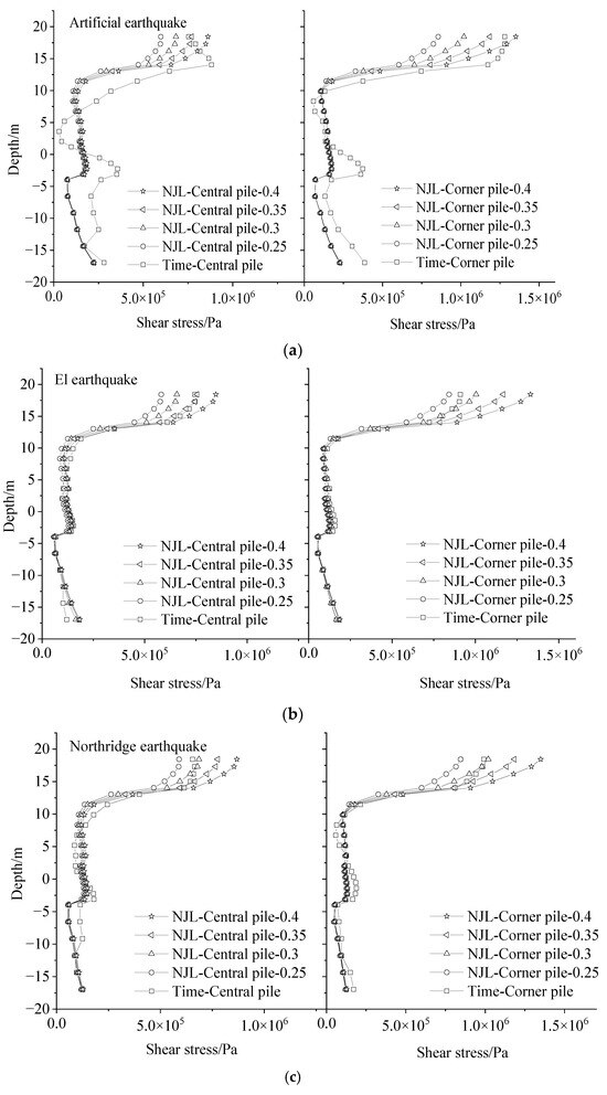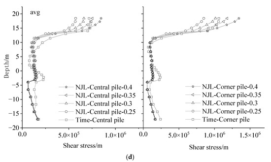 Comparison of shear stress along the pile length between central pile and angle pile: (a) artificial earthquake; (b) EI earthquake; (c) Northridge earthquake; (d) avg.