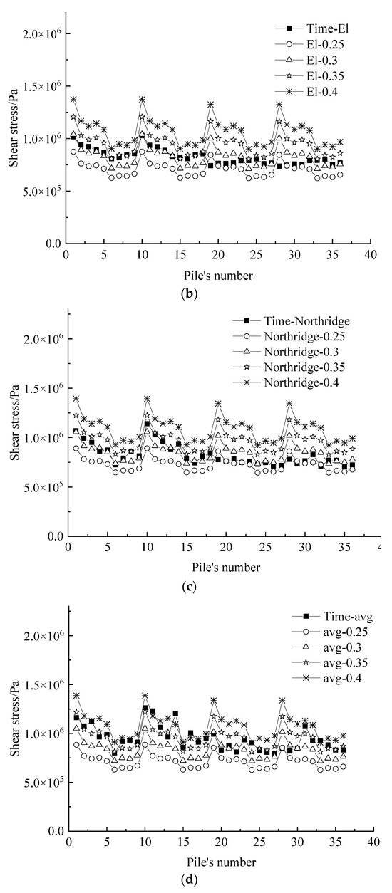 Comparison of shear stress envelope of pile top of pile group: (a) artificial earthquake; (b) EI earthquake; (c) Northridge earthquake; (d) avg.
