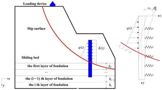 Numerous scholars have performed qualitative analyses of the stress mechanisms and characteristics of short anti-sliding piles through model experiments. Fu [4] conducted indoor model tests on fully buried anti-sliding piles, analyzing the internal forces, deformations, and displacement curves of these piles. They determined the distribution patterns of internal forces within anti-sliding short piles under the influence of landslide thrust and identified their failure modes. Zeng [5] explored the question of an appropriate pile length for anti-sliding piles through model tests and numerical analyses. The focus was on efficiently increasing pile length to ensure they effectively contribute to slope stabilization without extending beyond the slope’s crest. Li [6] carried out model tests on anti-sliding short piles and delineated three stages in the loading process: the zero displacement stage, effective deformation stage, and failure stage. They defined the boundaries of these stages as the critical starting load and critical anti-sliding load. With the rapid advancement of computer technology, numerical analysis has gained widespread use in geotechnical engineering analysis and calculations due to its cost-effectiveness and swift results [7,8,9,10,11,12]. The study of anti-sliding short piles follows suit. Lei, Y. [13] used the distribution of horizontal thrust behind anti-sliding short piles, and the magnitude of the resistance force in front of these piles was examined using ANSYS finite element software (https://www.ansys.com/, accessed on 8 November 2023). Liang and Chen [14,15,16,17] investigated the mechanisms, conditions, and optimal pile spacing related to the soil arching effect created by anti-sliding piles through computer numerical simulation. Hu [18], utilizing FLAC3D software (https://www.itasca.fr/en/software/flac3d, accessed on 8 November 2023), performed numerical simulations of anti-sliding short piles. The analysis included an examination of the impact of parameters such as pile length, pile diameter, pile wall thickness, and soil properties on the stress performance of the piles. These experiments and finite element analyses primarily concentrate on the stress characteristics, interactions between the piles and the soil, optimal pile spacing, and the determination of pile length for anti-sliding short piles. Nonetheless, the design and calculation theory for anti-sliding short piles remain insufficiently developed. Current calculation theories do not comprehensively capture the genuine stress characteristics of anti-sliding short piles. Furthermore, unified regulations or guidelines for their design calculations are lacking. Engineers frequently depend on their individual calculation methodologies and engineering expertise for analysis. To gain an accurate understanding of the stress characteristics and stress distribution patterns of anti-sliding short piles, it is imperative to establish a scientifically effective structural calculation method for these piles from a theoretical perspective.