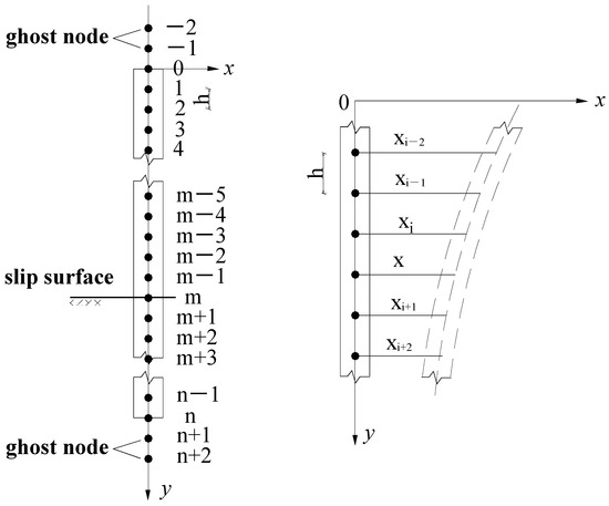 As illustrated in Figure 3, in the application of the finite difference method, it becomes essential to discretize the entire anti-sliding pile into n segments, where each segment possesses a length of h. Nodes are sequentially numbered from the pile head to the pile end as 0, 2, …, n. The node corresponding to the pile body at the sliding surface is designated as m. Furthermore, two virtual nodes are introduced above the pile head and beneath the pile base, marked as −2, −1, n + 1, and n + 2, resulting in a total of n + 5 nodes.
