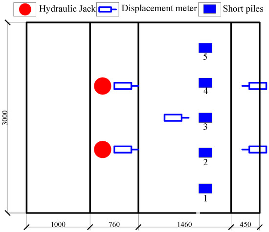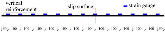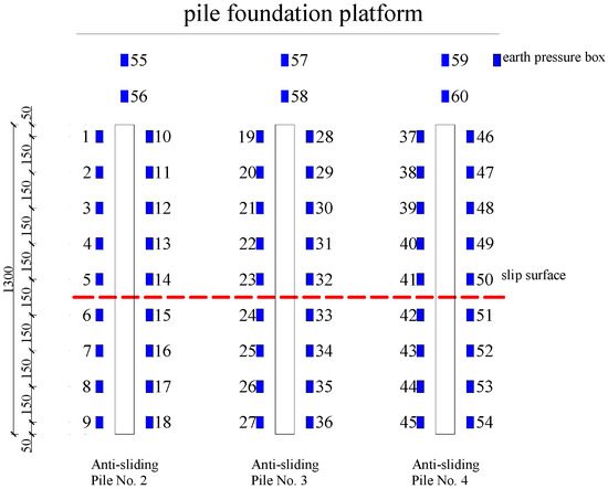 In the model experiments, a variety of measuring instruments and tools were utilized, such as resistance strain gauges, soil pressure cells, displacement meters, and more. The arrangement of these instruments is illustrated in the schematic diagrams presented in Figure 7, Figure 8 and Figure 9.
