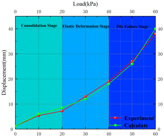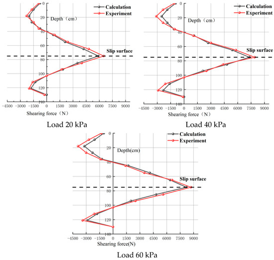 It is evident that the force and displacement curves closely align with the stress calculation model, showing a high degree of consistency. Furthermore, the numerical values at loading stages of 20 kPa, 40 kPa, and 60 kPa are nearly identical. This provides further validation for the rationality and applicability of the stress calculation model for anti-sliding short piles.