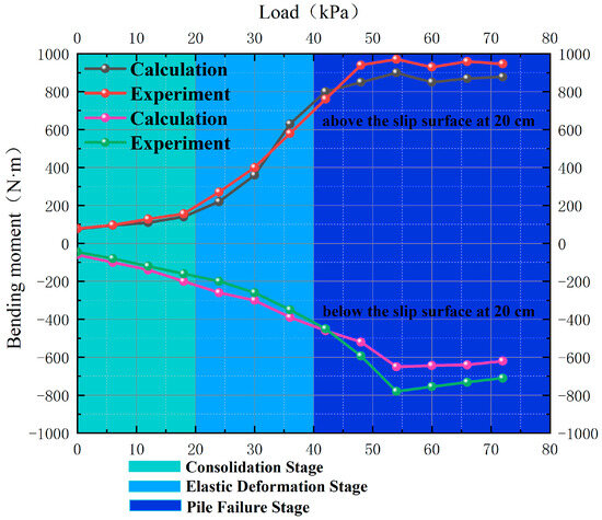 Figure 15 illustrates the comparison between model test and calculated model bending moments under varying loads, recorded at a depth of 20 cm both above and below the sliding surface (at the location of maximum bending moment). It is evident that, when subjected to identical loading conditions, the bending moments obtained from model testing and the theoretical calculations employing the finite difference method demonstrate relatively minor disparities. Furthermore, the fluctuation in bending moment corresponds to the three stages of pile deformation, namely the soil compaction stage, pile elastic deformation stage, and pile failure stage. As the load approaches 45–60 kPa, there is a notable increase in bending moment; this is consistent with the underlying elastic-plastic theory upon which the force calculation model relies, signifying substantial deformation of the pile body. This phenomenon aligns with the findings derived from the model experiments.