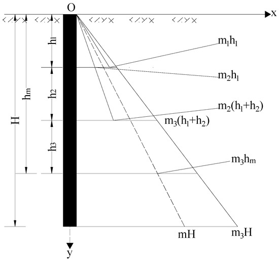 The quality of the soil within a specific depth range hm, close to the ground or the lowest erosion line, significantly influences the lateral soil resistance of the pile. Therefore, an average value ‘m’ for the foundation coefficients of various soil layers within the hm depth can be determined. This can be achieved either as a weighted average based on layer thickness or by ensuring equal areas before and after conversion to represent the ‘m’ value throughout the entire buried depth of the pile. As illustrated in Figure 18, in cases where there are three soil layers surrounding the pile, the areas under the original and converted foundation coefficient curves are equal within the hm depth, allowing ‘m’ to be determined as follows: