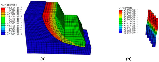 Based on the parameters outlined in Table 5, the ABAQUS software (https://www.3ds.com/products-services/simulia/products/abaqus/, accessed on 8 November 2023) parameters have been set up to create the Mohr–Coulomb computational model. Utilizing this model, simulations have been performed to generate displacement contour plots for both the sliding body and anti-sliding piles, as illustrated in Figure 21. Additionally, an analysis of the internal forces and displacement data for both the anti-sliding piles and the sliding body has been carried out.