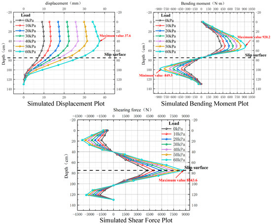 The stress calculation model for anti-sliding short piles under a load ranging from 0 to 60 kPa was employed to collect displacement, bending moment, and shear force data. These data were subsequently compared and analyzed alongside the experimental measurements to assess the validity of the developed anti-slip short pile force calculation model.