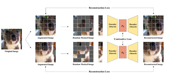 Overall architecture. Original image is converted into randomly masked images and after augmentation process. The encoder compresses them into and , which are used for contrastive learning. Given and , the decoder predicts the masked parts, thus outputting reconstructed images and .