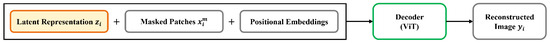 where , , and are visible patches, masked patches, and positional embeddings, respectively. A whole process of encoder is shown in Figure 6. Specifically, for encoder input, as represented in Equation (2), only visible patches and positional encoding are passed through to generate latent representations denoted as and , thus excluding masked patches in line with MAE, which allows for computing efficiency. Since ViT operates on image patches and uses self-attention mechanisms, which results in more computational complexity compared to CNNs, we should consider computational efficiency. We excluded masked patches, which means only 20% of image patches were computed with 80% of masking ratio.