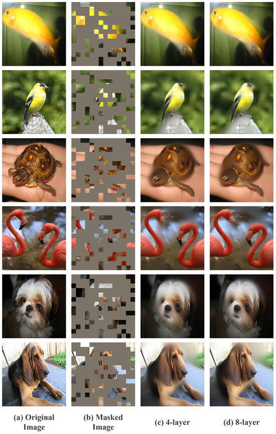 Visualization of reconstruction of different decoder depths for qualitative evaluation. (a) is the original input image, (b) is the masked image, (c,d) feature the predicted image with 4-layer and 8-layer, respectively.