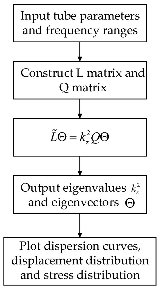 The wave equations in Equation (11), Equation (14), and the boundary conditions in Equations (15)–(19) constitute an eigenvalue problem. The traditional root-finding method is to select the appropriate general solution form of the wave equations, and to substitute the general solution into the appropriate boundary conditions to obtain a set of uniform linear geometric equations. The determinant of the coefficient matrix is set equal to zero, and the so-called dispersion equation is obtained. Finally, the root of the dispersion equation is found using numerical methods, and the dispersion relationship of modes is obtained.