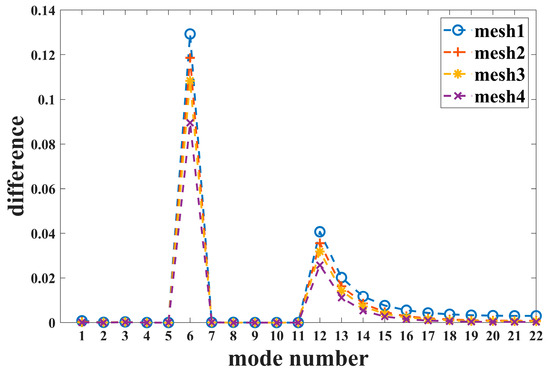 For the axisymmetric modes (), Baik [26] did not find the mode in Figure 8, obtained with the spectral method algorithm. For the non-axisymmetric modes (), Baik [26] lacked the modes , , , , , in Figure 8. The accuracy of the spectral method algorithm was verified using the results from the COMSOL simulation in the previous section.