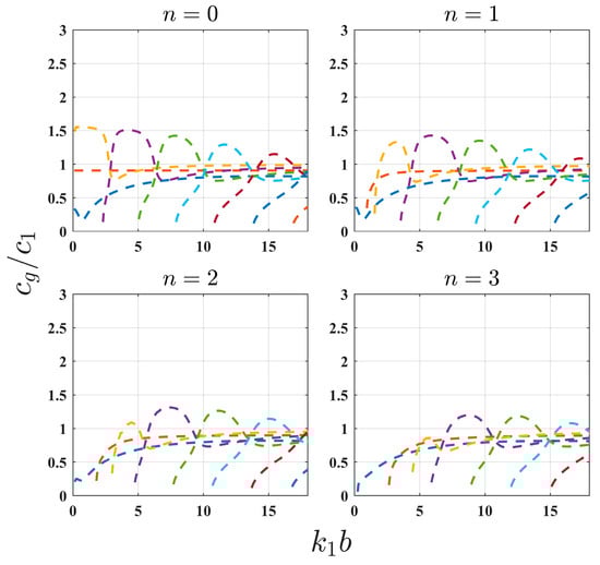Figure 8 shows the phase velocity curves of the axisymmetric modes () and the non-axisymmetric modes () of a water-filled PMMA tube propagating along the axis, as obtained from the spectral method algorithm. Figure 9 shows the group velocity curves of the corresponding modes. In the graphs, the horizontal axis is the dimensionless parameter and the vertical axis is the phase velocity or group velocity normalized by the sound velocity in water as or . All figures use to represent the circumferential order of the modes. The different color of lines in Figure 8 and Figure 9 denote a different group number of the modes with the same . Figure 8 and Figure 9 are compared with Figure 2 in Baik [26], which shows the dispersion curves of phase speed and group speed of modes for the water-filled PMMA tube obtained.