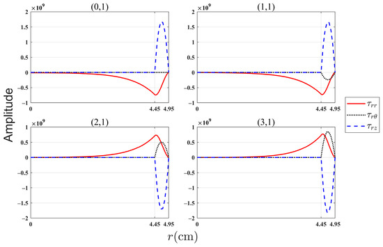 The phase velocities of modes , , , and in Figure 8 were lower than the sound velocity in water, and the longitudinal and shear bulk wave velocities of the PMMA tube. Figure 10 and Figure 11 show the radial distribution of the displacement components and the stress tensor components of the above four modes at kHz, obtained using the spectral method algorithm.