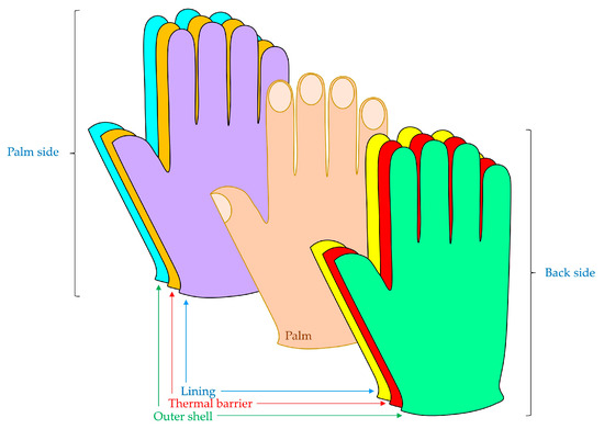Hand injuries are the most common type of injury we experience during our professional work. Their percentage, compared to all injuries, is 20–65%. Hand injuries sustained at work are much more severe compared to injuries sustained in other circumstances and require an extended period of treatment. It is impossible to completely avoid hand injuries during professional work because, in 90% of cases, injuries occur because of unpredictable and accidental human error [1,2]. Gloves protecting against hot thermal factors are defined as gloves that protect the user’s hands against heat from flames and hot surfaces of solids (e.g., metallurgical and blacksmith tools), hot liquids (e.g., molten metals), and gases (e.g., air heated by fire). Hot factors may occur in the form of radiant heat, convection heat, contact heat, flame, molten metal, or small splashes of molten metal. The possibility of protection against hot factors in industries such as metallurgy, welding, or foundry is a complex issue that requires a comprehensive approach and providing the employee with appropriate personal protective equipment [2]. Gloves intended to protect hands against hot factors, like other parts of protective clothing (firefighter garments [3,4,5], sleeping bags for newborns [6,7], civilian clothing [8,9,10,11,12,13]), are usually made of various materials or multilayer material systems (Figure 1).