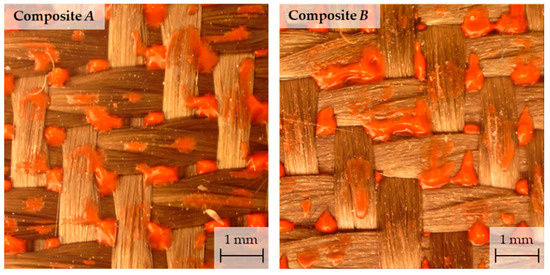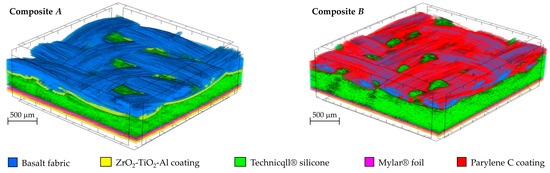 An additional difficulty in distinguishing the component layers of the coating was their thickness, which was close to the size of a voxel in 3D visualization. It can be observed that in composite A, there is a ZrO2-TiO2-Al coating. (marked in yellow) deposited on the inner side of the basalt fabric (marked in blue) did not penetrate between the fibers into the yarn and did not penetrate the outer side of the fabric. In composite B, it is clearly visible that the coating of parylene C (marked in red) deposited on both sides of the basalt fabric did not penetrate between the fibers into the yarn. Moreover, it can be observed that this coating was not deposited evenly on the surface of the basalt fabric, which resulted primarily from the very complicated spatial geometry of the fabric. In both composites, it is also clearly visible that a certain amount of silicone (marked in green) in the process of joining with the fabric, as a result of the applied mechanical load, penetrated to the other side of the fabric through the free spaces between the weft and warp yarns. This effect is even more clearly visible in the photos of the inner side of both composites (Figure 4), where the silicone is marked in orange.