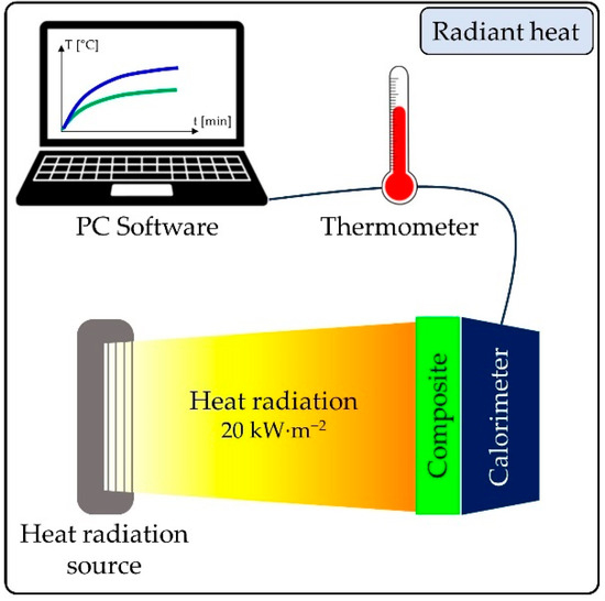 The manufactured composites were tested for resistance to radiation heat in accordance with EN ISO 6942 [35,37], taking into account the guidelines contained in the standard EN 407 [36]. Figure 6 shows a scheme for the radiant heat method.