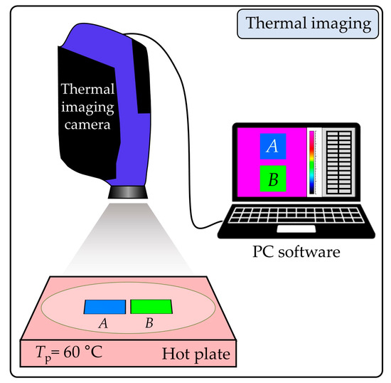 Both techniques presented above (contact heat and radiant heat) were used to test the use of both composites in thermal gloves in terms of user safety in hot environments. The evaluation of both composites was based on functional parameters (tt and RHTI24). However, both techniques did not allow for a more accurate analysis of the process of gradual heating of both composites over time due to the heat supplied by the environment. For this purpose, a third technique was used in which the heat transfer through the composites placed on a hot plate at a constant temperature was investigated using thermal imaging. The scheme of the experiment is shown in Figure 7.
