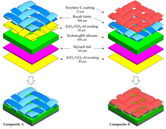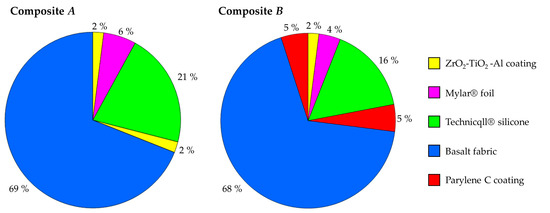 In the case of composite A, a 30 μm-thick ZrO2-TiO2-Al coating was applied to the inner side of the basalt fabric in the PVD process using magnetron sputtering (equipment). Its inner ZrO2 layer and middle TiO2 layer were 7.5 μm thick each, while the outer Al layer was 15 μm thick. The same coating was additionally applied to the outside of the Mylar® foil in both composites.