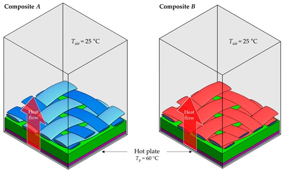 The direct purpose of simulating heat transfer through the tested composites was to compute the mean temperature of the lining (TL) of both composite 3D models in the same conditions under which the thermal imaging experiment was performed on actual composites. For this purpose, 3D models of both composites were located on a hot plate model (cuboid of the same area) at a temperature Tp = 60 °C analogously to their real counterparts during thermal imaging. The composite model and hot plate model were situated on the bottom of the cuboidal computational domain (4.8 mm × 4.4 mm × 6.0 mm) and filled by air at a temperature of Tair = 25 °C (Figure 9). To get rid of the negative impact of boundary conditions on the precision of heat transfer calculations, periodic boundary conditions were used to simulate the continuation of the composite model outside the computational domain. During heat transfer simulations, the space bounded by the computational domain was divided into three types of finite volumes, i.e., (1) solid (containing the composite model and the hot plate model), (2) gaseous (containing air), and (3) partial (containing the composite model or the hot plate model and air). The number of volumes was different for each 3D composite model as a result of the different spatial geometry of the layer models forming the composite model (Table 3).