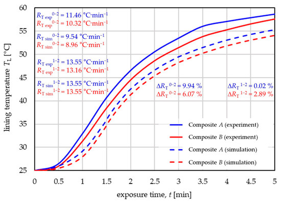 The results presented in Figure 11 show the correlation between the actual and simulated heating processes of both composites. Both the thermal imaging results and the simulation results showed that a more effective heat barrier was composite B, which heated up significantly slower compared to composite A. Moreover, the results obtained show that both tested composites are characterized by lower thermal insulation than their three-dimensional models. Moreover, the differences in the heating rate of both composites are greater than the differences in the heating rate of both models. Based on the obtained experimental and modeled TL = TL(t) relationship curves, they were calculated and presented on a graph of the rate of increase in the lining temperature in the first two seconds of the composites heating process (RT exp0−2; RT sym0−2) and between the first and second minute (RT exp1−2, RT sym1−2). In the first two seconds of the experiment, composite A heated up at a rate of RT exp0−2 = 11.46 °C·min−1, while composite B heated up at a rate of RT exp0−2 = 10.32 °C·min−1. The heating rates calculated based on the simulation were RT sim0−2 = 9.54 °C (composite A) and RT sim0−2 = 8.96 °C·min−1 (composite B). The percentage differences between the experimental and simulated values of this coefficient were: (ΔRT 0−2 = 9.94% for composite A) and (ΔRT 0−2 = 6.07% for composite B). A clearly greater agreement between the experimental and simulated TL = TL(t) relationship was obtained between the first and second minutes of the composites heating process. At this stage of the experiment, composite A heated up at a rate of RT exp1−2 = 13.55 °C·min−1, while composite B heated up at a rate of RT exp1−2 = 13.16 °C·min−1. The modeled heating rates were RT sim1−2 = 13.55 °C·min−1 for both composites.