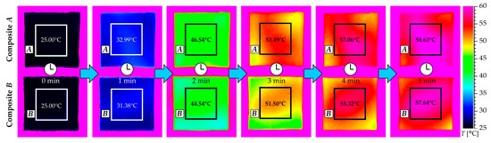 Thermograms of tested composites obtained in five consecutive minutes of the experiment (analyzed surface area: 20 mm × 20 mm—indicated by square).