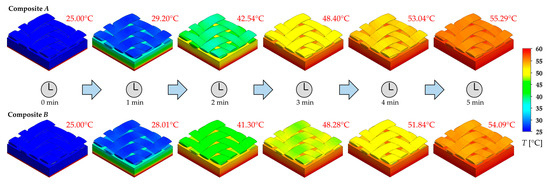 The percentage differences between the experimental and simulated values of this coefficient were: (ΔRT 1−2 = 0.02% for composite A) and (ΔRT 1−2 = 2.89% for composite B). Differences between (ΔRT 0−2) and (ΔRT 1−2) may result from the too-simplified structure of the designed three-dimensional models of both composites. The most likely reason for the discrepancy in the experimental and simulated results is the failure to take into account in both composite models the presence of a certain amount of silicone between the weft and warp yarns (shown in Figure 2 and Figure 3) created in the composite forming process as a result of the applied mechanical load. The silicone present between the weft and the warp reduced the porosity of the basalt fabric and thus contributed to reducing the thermal insulation properties of the entire composite. The consequence of this may be a faster heating rate for both composites compared to their models. The discrepancy in the heating kinetics of both tested composites between the experimental and simulation results could also be influenced by the heterogeneity of the morphology of the layers from which they were built. This hypothesis may be confirmed (in addition to micro-CT tests) by thermograms (shown in Figure 13) illustrating the temperature of the lining in the next five minutes of the heating process of both composites.