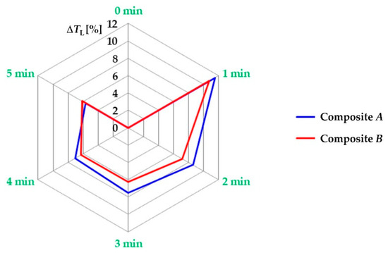 The largest differences were obtained in the first minute (11.5% for composite A and 10.8% for composite B), which decreased over time to reach the lowest values in the fifth minute (5.7% for composite A and 6.1% for composite B). Based on the temperature distribution over the thickness of each composite model (Figure 13), the heat losses in each layer of the composite were computed and shown in Figure 16. Analogous computations were not possible in the case of thermal imaging data due to the lack of spatial resolution of the thermogram; however, a close correlation of TL occurred between the simulations and the experiment, and it can be supposed that the simulated heat losses are not much different from the corresponding experimental values.